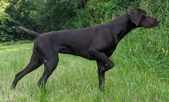 Ori vom Mausberg braun, Zb.Nr. 0880/19, gew. 26.05.2019, Derby 1, Solms 1, Nase u. , St. m. E. 4H, VGP 1, Nase, Vorstehen, ÜF 4h, Sicht- u. Spurlaut, SW1, FsII/ Formwert JK sg, Brauchbarkeitsprüfung, HD A1, aus Etzel vom Thüringer Zipfel, Zb.Nr. 1172/10 x Gina vom Mausberg Zb. Nr. 0532/15 Ori ist eine überaus passionierter Jagdhundin. Sie ist leichtführig mit außerordenlicher Bringfreude und Wasserpassion. Sie besticht mit ihrem Suchenstil und ihren Vorstehleistungen. Ihren Finderwillen bringt sie mit ihrer hervorragenden Fährtenarbeit zum Ausdruck. Ihre Leistungsbereitschaftzeigt zeigt sie beim jagdlichen Einsatz. Ori wird auch als Zuchthündin verwendet. Sie ist für die nächste IKP und Dr. Kleemann-Prüfung vorgesehen. Ori ist angenehm in der Zwinger- und Haushaltung. Mit Kindern und Hunden ist sie unauffällig.
