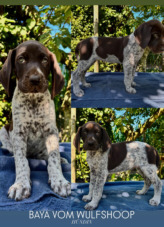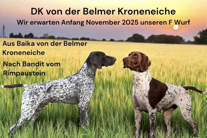 ZB.Nr. 0049/19, D1, S 1, Btr, HD 0(B1), Formwert: sg2 (j), Beide Elterntiere stehen im vollen Jagdeinsatz und haben sich hier mehrfach bewiesen Zwinger "von der Belmer Kroneneiche" Aus Baika von der Belmer Kroneneiche, Zb.Nr: 0439/21, Gew. am 19.12.2020, HBrschl.m.br.K.u.Pln., D1, S1, VGP 1, sichtlaut, HN, HD A2, OCD- frei, Fw. V 1 Nach Bandit vom Rimpaustein, Zb.Nr. 0585/23, Gew. am 30.03.2023, Brschl.m.Pln., D1 (4h Vorstehen), S1 (4h Vorstehen), VGP1 (349 Pkt. Totverbeller), sichtlaut, Saujager, BTR, HN, HD A2, OCD-frei, Fw. JK SGweitere Infos finden Sie auf unserer Homepage : www.dk-belmer-kroneneiche.de