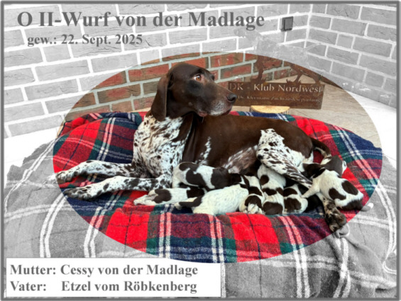 "von der Madlage" Am 22. Sept. 25 ist unser O_II Wurf mit 5,4 starken braunschimmel Welpen gefallen. Mutter: Cessy von der Madlage,