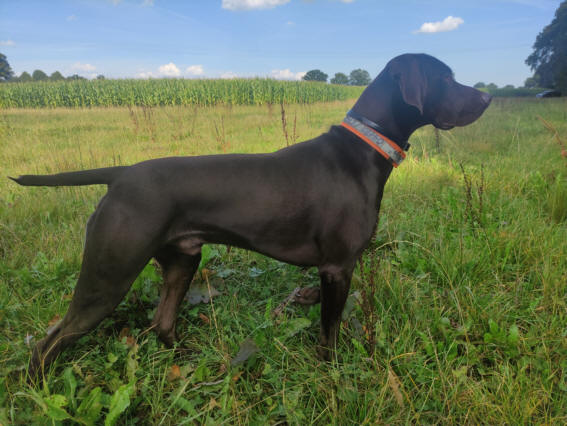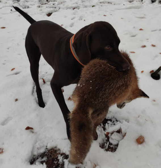 Cliff vom Wohld ZB-Nr. 0180/21, Braun., gew. am 12.11.2020 VJP 70 Punkte, HZP 152 Punkte, VGP 325 Punkte ( 1 Preis) HN, Btr, HD-A2, OCD frei, Formwert: SG Cliff ist ein sehr eleganter Rüde mit korrektem Kopf und gut angesetzten Behängen. Außerdem zeichnen ihn seine korrekte Rückenlinie und seine gute Brusttiefe aus. Cliff besticht durch seine vorzügliche Wasserarbeit. Selbst bei den widrigsten Temperaturen und dem dichtesten Bewuchs arbeitet er ausdauernd und zielstrebig und gibt keine Ente verloren. Seine bedingungslose Raub und Schwarzwildschärfe konnte Cliff schon auf diversen Treib und Drückjagden eindrucksvoll beweisen.