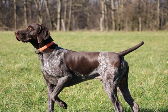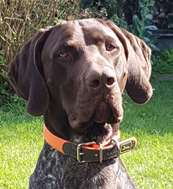 Dougal von der Kropstädter Heide ZbNr.0183/18, gew.: 11.12.2017, DGStB: 73927, Dbrschl.m.br.K.u.Pln.,FW: V1, Größe 68 cm, HD frei- A2, OCD-frei und ED-frei D1, VJP 70 Pkte., HZP 163 Pkte., AZP1, VGP 3. Preis 284 Pkte., HN, sichtlaut Vater: Pollux II vom Osterberg (1173/14); Mutter: Cita von der Kropstädter Heide (1355/14) Dougal ist ein kapitaler und sehr dunkel pigmentierter Braunschimmelrüde, mit typischen braunen Rüdenkopf und sehr trockenem Hals. Ober- und Unterlinie sind korrekt, mit gut angesetzter Rute. Im Gangwerk vorne und hinten korrekt. Er ist von klein an, in Niederwildrevieren im regelmäßigen jagdlichen Einsatz und ist deswegen alljährlich ein willkommener Gast auf Treib- und Drückjagden. Besonders hervorzuheben ist seine feine Nase, seine Leidenschaft bei der Wasserarbeit und sein kompromissloser Finderwille. Der Rüde ist mit Kindern und anderen Hunden aufgewachsen und überzeugt immer wieder durch sein souveränes, freundliches und verträgliches Wesen. Er ist zu 100 % ein Jagd-, Familien- und Bürohund. |