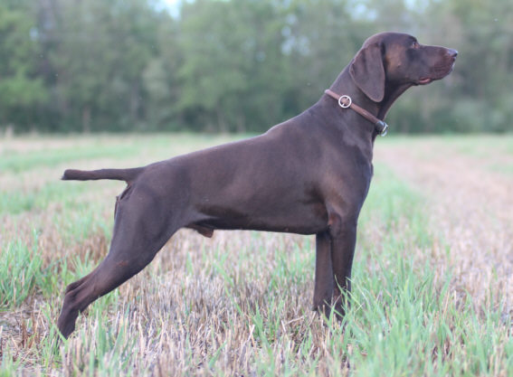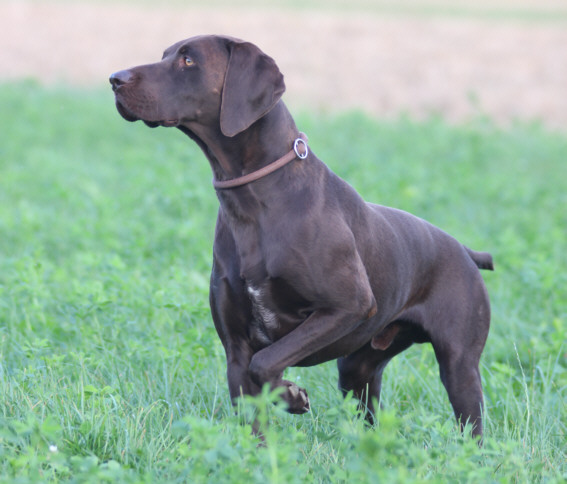 ZB.Nr. 0309/18, gew. am: 06.02.2018, braun Leo vom Mausberg ist ein kompakter, sehr gut bemuskelter brauner Rüde des mittleren Schlags. Bereits im jungen Alter zeigte er seine Härte am Fuchs anlässlich einer Treibjagd. Im Feld ist seine Suche planmäßig, ausdauernd und raumgreifend. Bei der Wasserarbeit beeindruckt Leo immer wieder mit seinem Willen Beute zu machen und seiner feinen Nase. Leo wird auf zahlreichen Drückjagden, insbesondere auf Schwarzwild, eingesetzt. Dennoch ist er ein ruhiger, leichtführiger und verträglicher Hund mit sehr gutem Gehorsam, der sich im Alltag mit der Familie als sehr angenehm zeigt. |