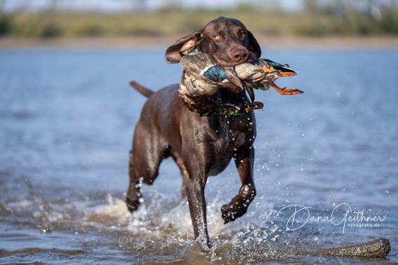 KS Bero von der Nordhoop Zbr.Nr. 0350/19, Br.m.Brfl., gew. am 22.02.2019 HN, LN, BTR, D1 (4h Vorstehen), S1 (4h Vorstehen) Suchensieger, HZP 220 Pkt., VGP1 (349 Pkt. Totverbeller, 4h Wasser), Armbruster Haltabzeichen (AH, spurlaut) Suchensieger, SJ HDA2, ED+OCD sowie Übergangswirbel fehlerfrei, Formwert: V2, Größe 67cm Bero ist ein substanzvoller, kapitaler Rüde mit viel Adel und hervorragenden Vorstehmanieren. Er kommt nach Bruno KS vom Sauwerder und Athene KS von der Nordhoop. Bero ist ein Ebenbild seines Vaters Bruno KS vom Sauwerder und seines Großvaters, Vitus KS vom Dinkelhof. Bereits mit 7 Monaten hat er wie seine Mutter seine kompromisslose Raubwildschärfe innerhalb einer Woche am Waschbären, Fuchs und Marderhund mehrfach bewiesen und die Bringtreue in 2020 vor der Derby erfolgreich absolviert. Dieser souveräne und ausgeglichene Rüde bringt sehr viel Arbeitsfreude, eine hohe Passion und große Ausdauer mit. Er überzeugt durch planvolle Suchen, einem raumgreifenden Sprung und sehr guter Nase im Feld, genauso wie als hervorragender Stöberer im Wald oder im Wasser, wo ihn auch die dichteste Schilfwand nicht aufhalten kann. Hervorzuheben sind seine hervorragende Vorstehanlage (4h Derby und Solms), seine exzellenten Feldmanieren, Selbstsicherheit, Ruhe und Führigkeit. Bero steht nahezu im täglichen jagdlichen Einsatz in einem Niederwildrevier. Er ist absolut familientauglich, auch mit kleinen Kindern, ruhig im Haus und im Auto, wenn er warten muss und sozialverträglich mit Rüden. |