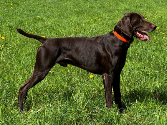 V, Nobel ist ein muskulöser, selbstbewusster und wesensfester brauner Rüde des Mittelschlags. Er konnte sogar auf der Zuchtschau 2023 des Deutsch-Kurzhaar-Vereins Mainfranken e.V. in der Altersklasse Rüden den Sieg mit dem begehrten Prädikat V1 erringen. Nobel ist ein leistungsstarker, hochpassionierter Rüde, der mit viel Arbeitsfreude im Feld, Wald, Wasser und Schilf ans Werk geht. Er zeigt ein ausdrucksvolles und festes Vorstehen sowie eine außerordentliche Wasserfreude, auch bei niedrigen Temperaturen. Seinen hohen Finderwillen konnte er nicht nur auf der Bringtreueprüfung als Suchensieger unter Beweis stellen. Mit seiner sehr feinen Nase überzeugt er auch auf der Schweißfährte. Er zeigt sich sowohl im heimischen Niederwildrevier als auch bei diversen Jagdeinladungen sowie auf Drückjagden als zuverlässiger und angenehmen Jagdbegleiter. Raubwild wird von ihm zuverlässig abgetan, was er auch durch einen Härtenachweis belegt. Der Rüde wird bei uns im Haus gehalten und ist ein unkomplizierter und ruhiger Begleiter im (Arbeits-)Alltag. Artgenossen (sogar Welpen) und Kindern tritt er stets aggressionsfrei, umgänglich und besonnen entgegen. |