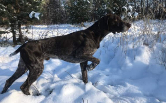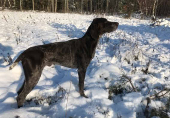 D Don ist ein dunkler Braunschimmelrüde mit schönem Rüdenkopf sowie korrekter Ober- und Unterlinie. Mit einer Widerristhöhe von 66cm gehört er zum Mittelschlag der Rasse. Im Feld arbeitet Don mit raumgreifender Suche und feiner Nase (Nase 4h). Gefundenes Wild steht er mit ausdrucksvollen Manieren vor. Trotz seiner weiträumigen Suche hält er stets Blickkontakt und arbeitet Führer bezogen. Im Wasser arbeitet er freudig, ausdauernd und selbständig. Gefundenes Wild trägt er sicher zu. Am Raubwild arbeitet er kompromisslos. Bei Drückjagden hat er Fährten- und Sichtlaut gezeigt. Zusätzlich zu den oben genannten Prüfungen hat er die Brauchbarkeitsprüfung des Landes Brandenburg auf der 600m Übernachtfährte bestanden. Die VGP hat er ebenfalls mit ÜF absolviert. Don hat ein freundliches, ausgeglichenes Wesen. Er lebt im Rudel und fügt sich problemlos ein. Don kommt aus einem fehlerfreien Wurf mit 6 Welpen. Über seine