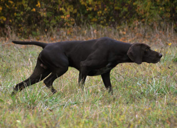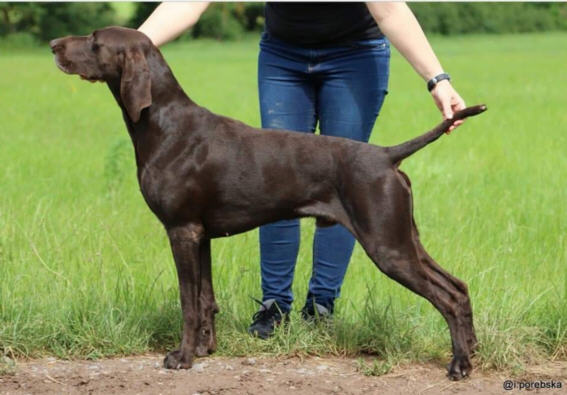 Dorian von den Donaumündungen ZB.Nr. 9002/17, gew. 29.01.2016 Dorian ist mit seinen 66cm Stockmaß ein kapitaler und zugleich eleganter Rüde. Er besticht durch sein äußerst dunkles Pigment, seinen langen Fang mit ausgeprägter Rammsnase und seiner perfekten Winkelung der Vorder- und Hinterhand. Er jagt stets mit Verstand und passt seine Geschwindigkeit sowie seine Suchentfernung immer dem Bewuchs und der jagdlichen Situation an. Große prüfungsnahe Suchen geht er mit sehr hohem Tempo, umso schöner ist es, dass seine Nasengüte dem entspricht. Er imponiert durch feinste Manieren. So vereint er hohe Nasenführung bei der Feldsuche und ebenso tiefe Nase auf der Hasenspur, welche er mit Spurwille und Ausdauer voranbringt. Bei der Jagd auf Enten und Gänse lässt er sich gut steuern, arbeitet aber bevorzugt selbstständig und überwindet große Distanzen und Zeiträume, um seinen Erfolg durchzusetzen. Eiswasser ist ihm kein Hindernis. Mittlerweile ist er ca. 100 Gesellschaftsjagden gelaufen. Er arbeitet im Team, aber genießt es genauso Alleinakteur sein zu dürfen. Er bindet sicher Sauen, sodass diese abgefangen werden können. Seine Raubzeugschärfe konnte er im ersten Feld bereits auf mehreren Treibjagden an Füchsen unter Beweis stellen. Er steht in einem Revier, in dem es täglich vielseitige Arbeit zu leisten gilt. Er ist verträglich und hat ein absolutes Fabel für kleine Kinder und Welpen. Bisher sind acht Würfe mit 60 Welpen nach ihm gefallen. Laut Rückmeldung vererbt er vor allem seine Wasserfreude, Ruhe und Frühreife und sein dunkles Pigment. Beim Decken zeigt er sich absolut instinktsicher. Gerne können sie meinen Rüden bei der Jagd in Augenschein nehmen. |